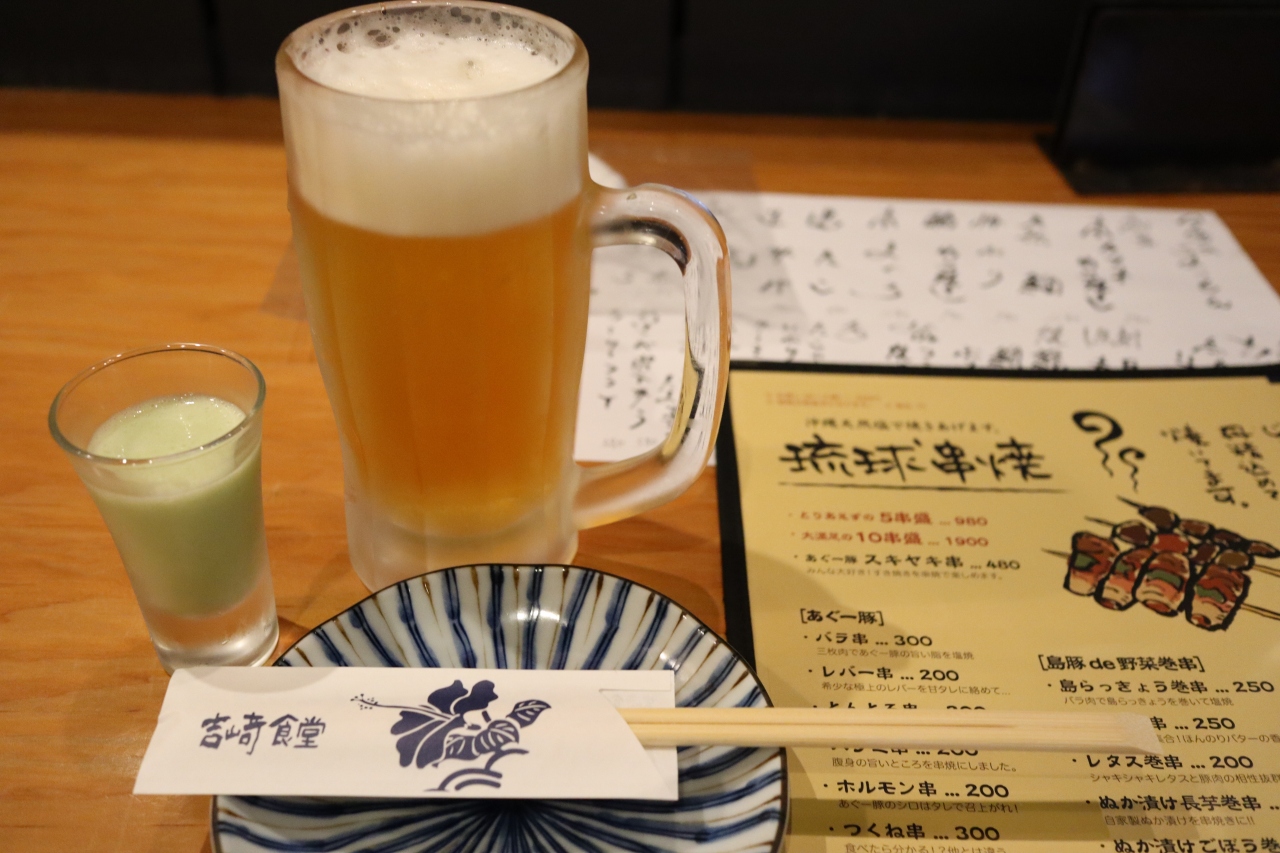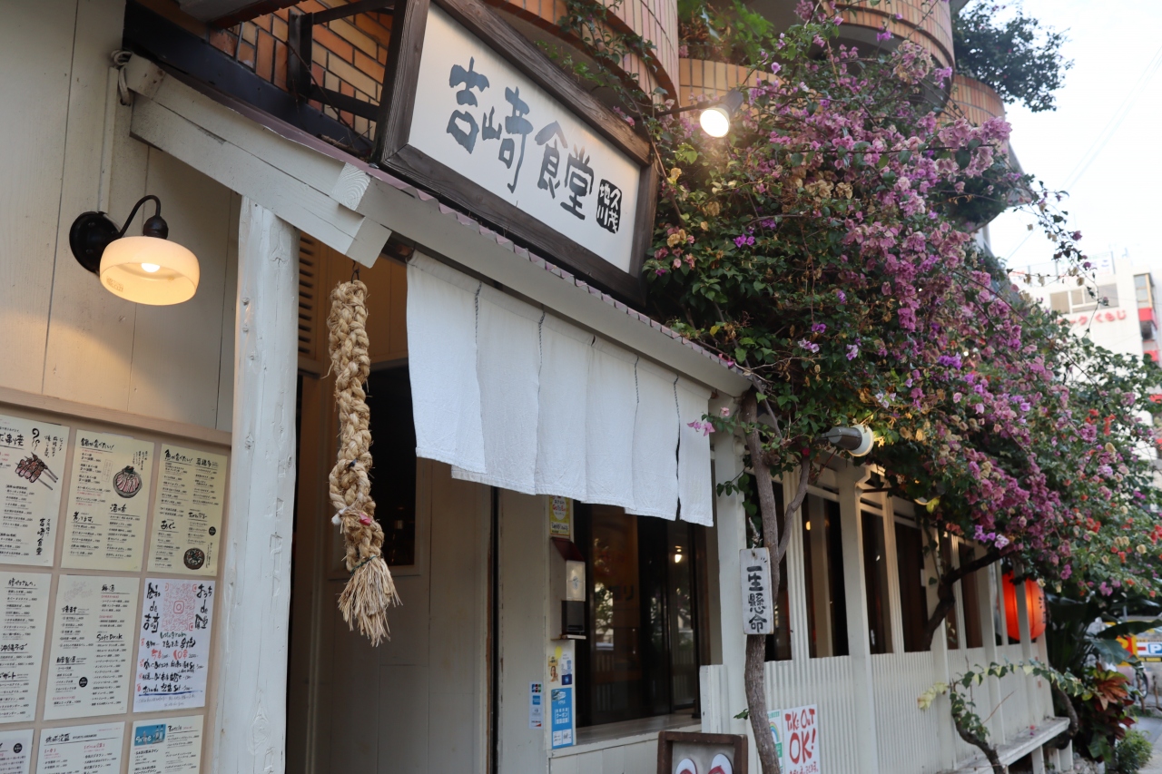 場所は県庁前から御成橋で久茂地川を渡ってすぐ右に川沿いを少し行ったところにあります。右折する角に「吉崎食堂→50m」と表示があります。予約していませんでしたが、早い時間にふらっと立ち寄りカウンターに座れました。沖縄料理はもちろん普通に焼き鳥串などもありこれがまたタレがおいしかったです。一人で3,500円前後で満足できました。