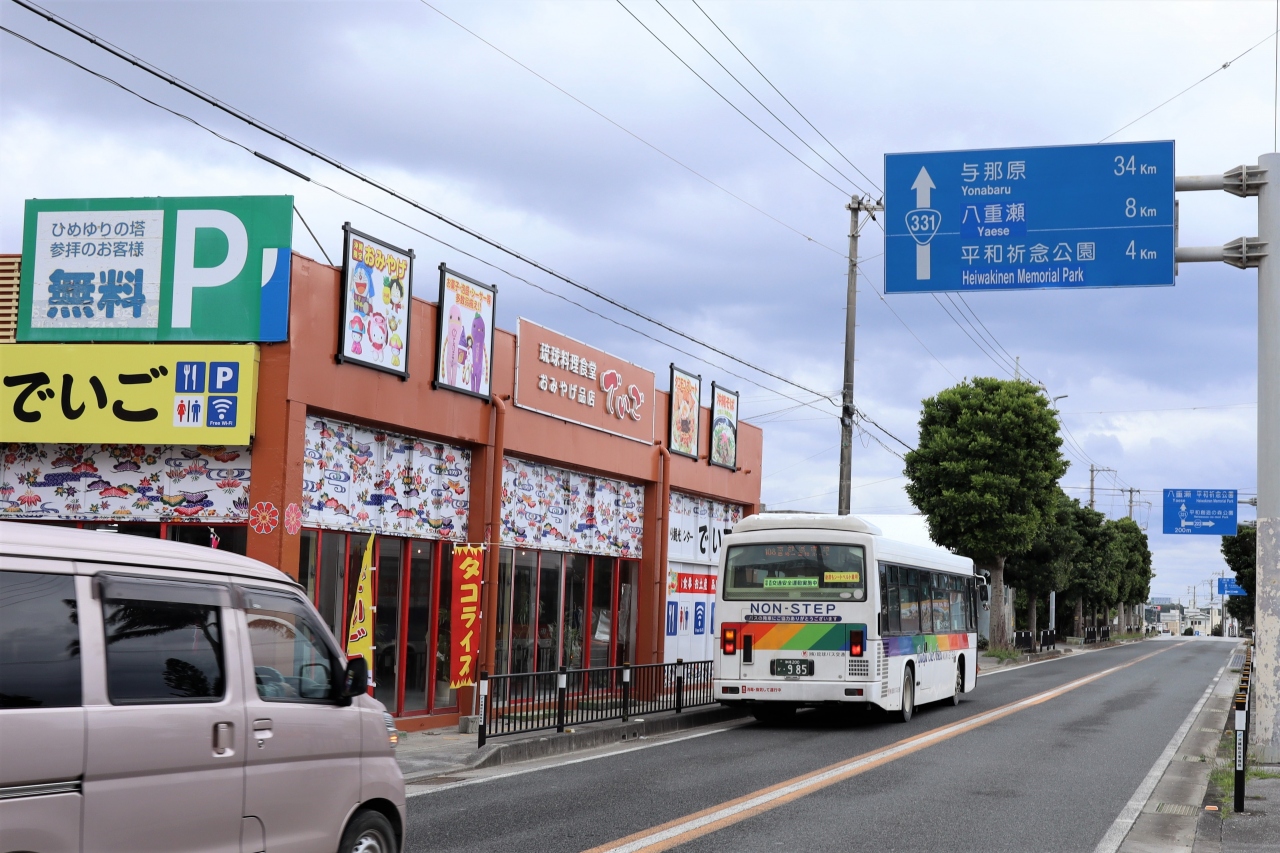 那覇からは通常であれば団体観光バスやレンタカーを利用するのが一般的ですが、路線バスで行くこともできます。その場合、糸満バスターミナル経由で一時間半くらいはかかります。バス本数は少なめなので帰りの発車時刻を到着時に確認してそれに合わせます。