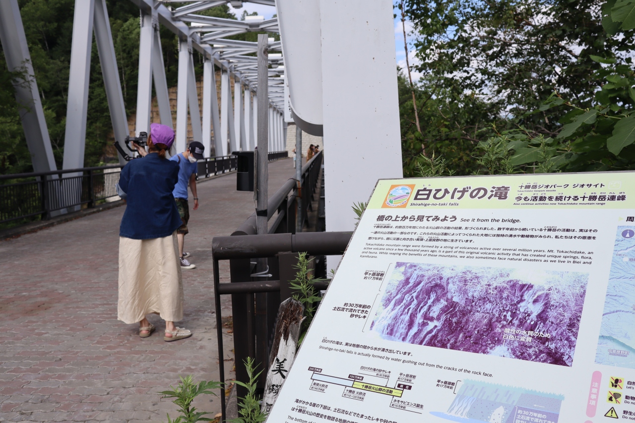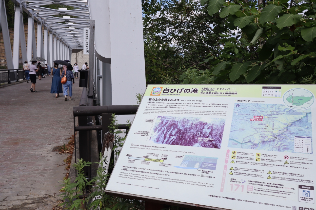 場所は北海道上川郡美瑛町白金。「白ひげの滝」は道道966号線沿いの白金温泉にあり、十勝岳連峰の地下水が溶岩層の割れ目から白ひげのように美瑛川に流れ落ちていく滝で、落差30mの滝は白い髭のように見えます。