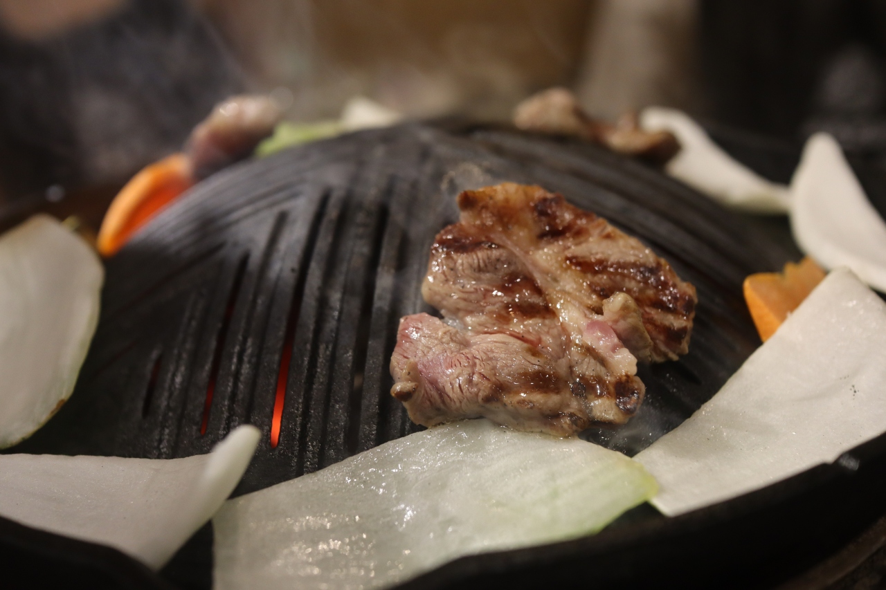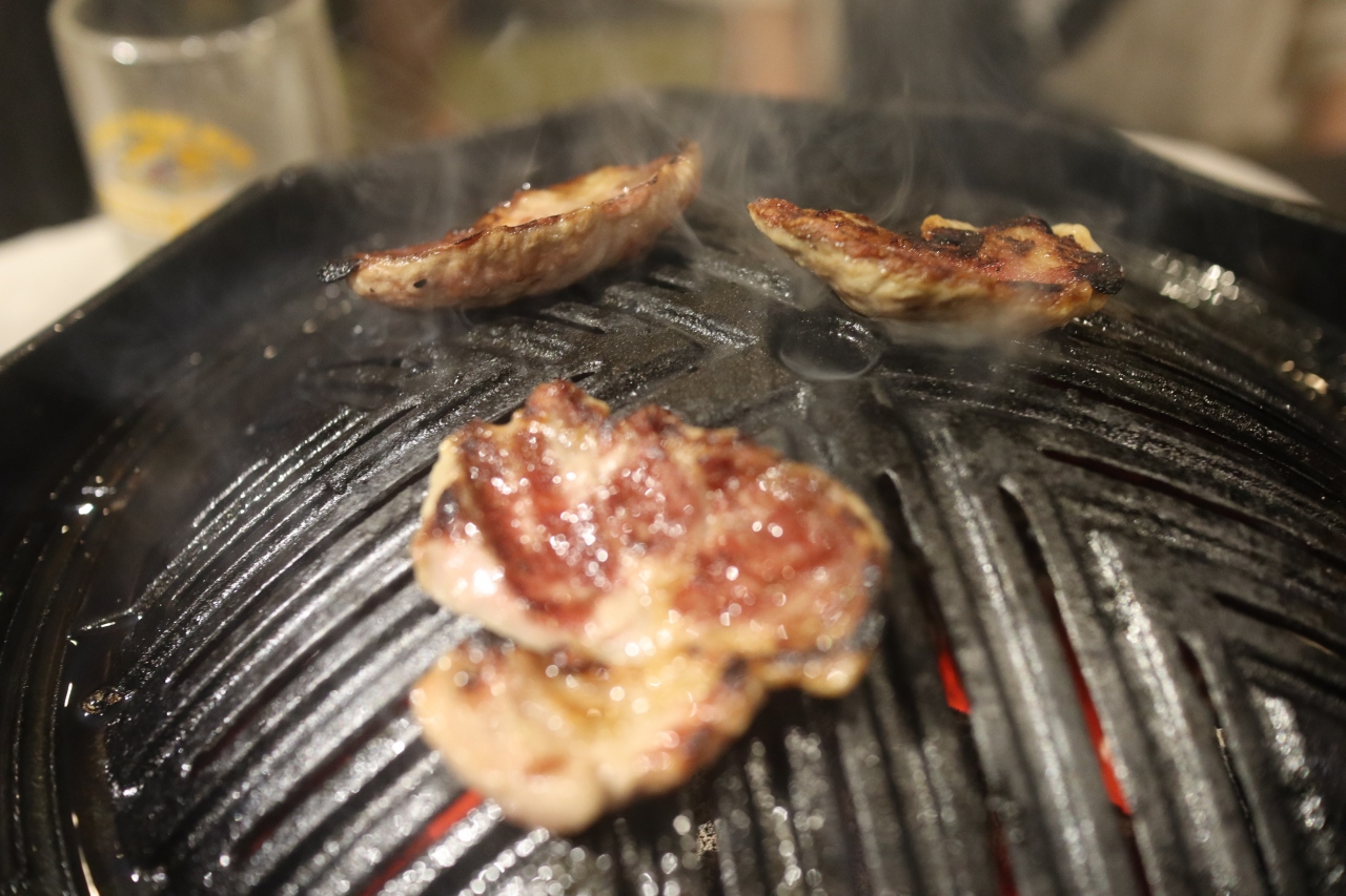 二階席は小上がりで4人がけの四角いテーブルでした。お肉を焼いていると煙がモクモク出て周りの方に迷惑をかけたかもしれません。お店の方が窓を開けてくれました。めちゃくちゃ繁盛しています。- 旅行時期
