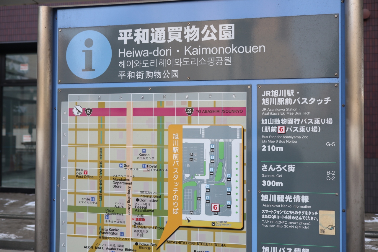 平和通買物公園という旭川の繁華街にまっすぐ行けますし、旭川駅直結でイオンモールがあり便利です。駅構内は木材がふんだんに使用され吹き抜けで開放感が抜群です。旭山動物園行の路線バスは6番のりばからです。駅構内には「誰でもピアノ」があります。