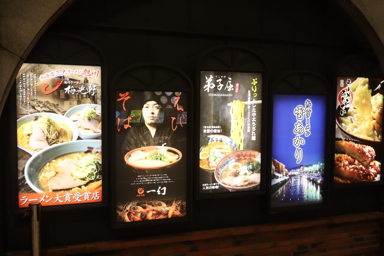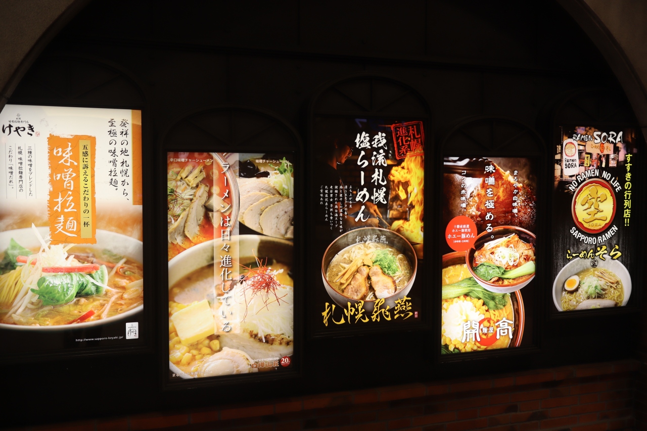 北海道を代表するラーメン店がいくつも軒を連ねているので楽しくなります。一番手前のえびそば一幻は大体いつも行列になっていますが、現在、他店は待ち時間があまりなく提供されると思います。