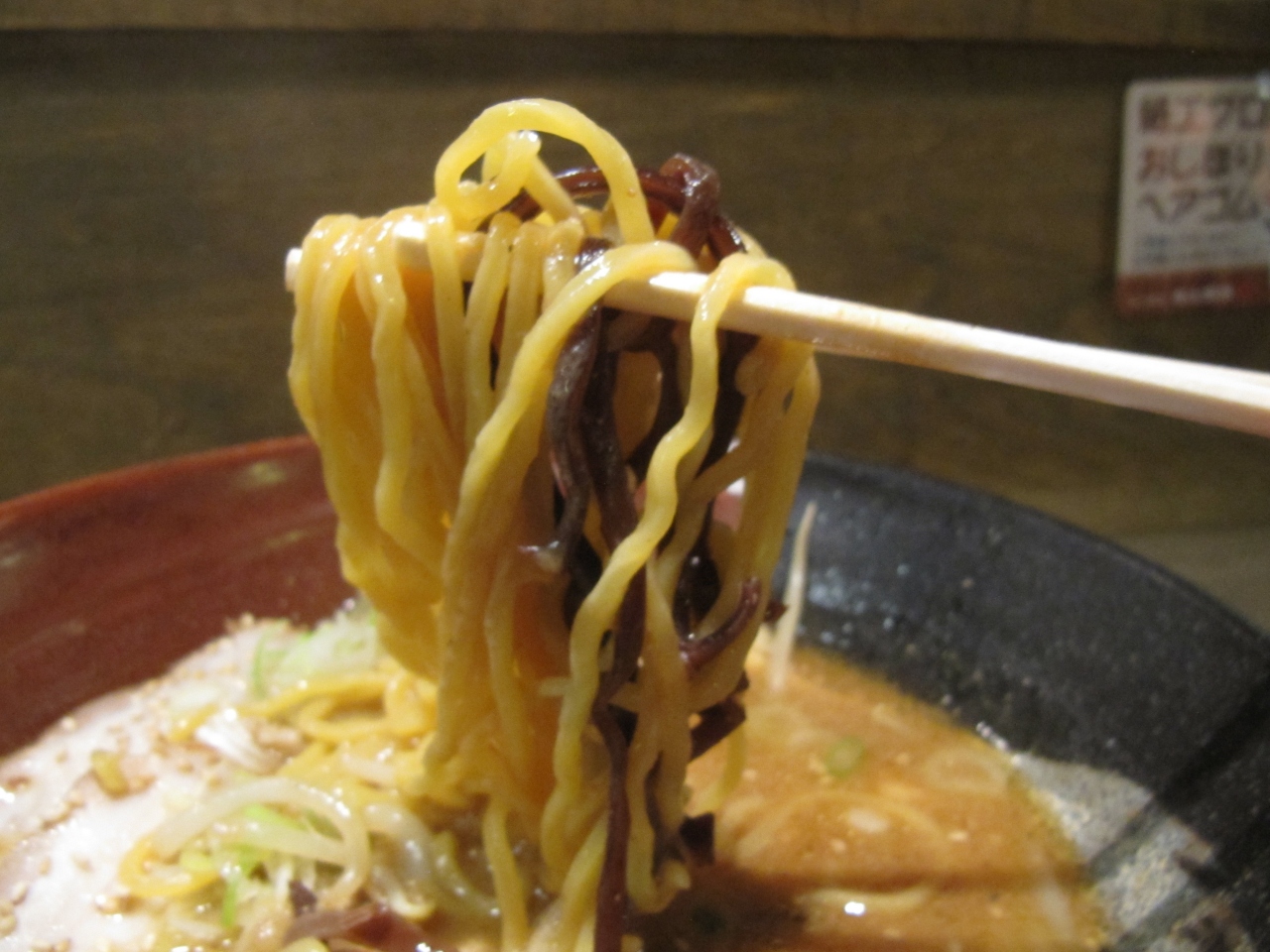 - 濃いめ味噌ラーメンで玉子ちぢれ麺