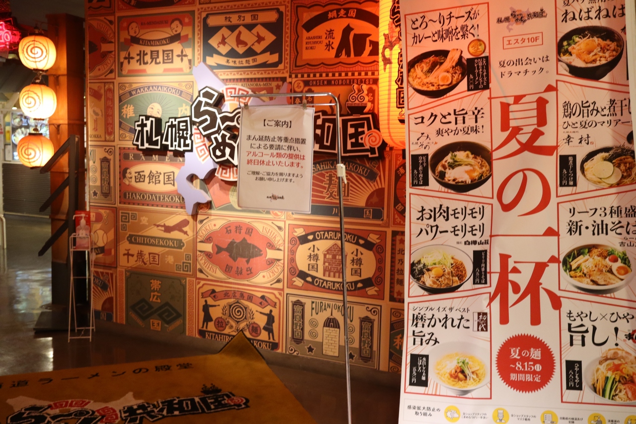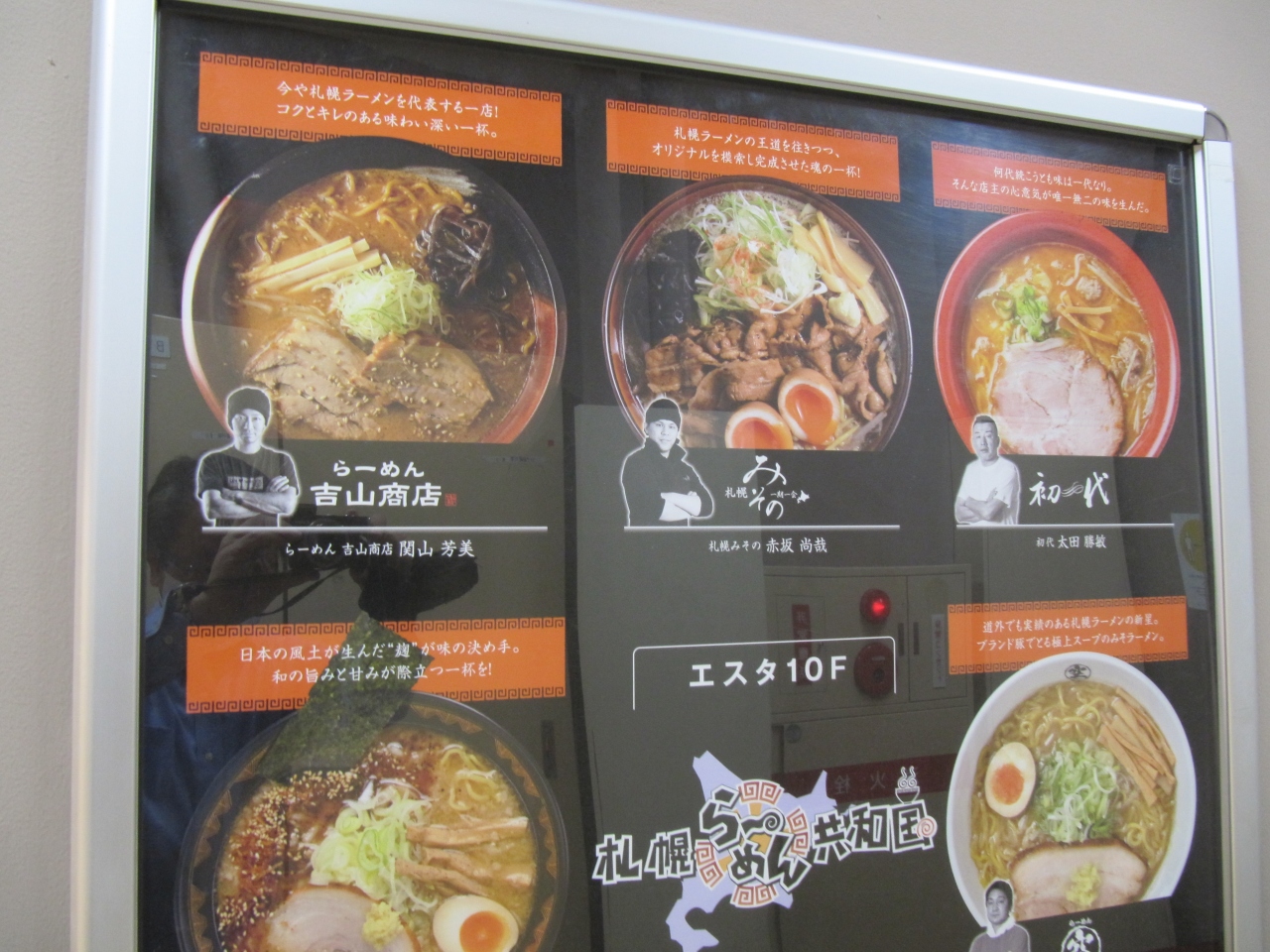 札幌エスタ10階にある北海道ラーメンの殿堂『札幌ら~めん共和国』。JR札幌駅直結で地下からノンストップ直通エレベーターもあります。白樺山荘、吉山商店、らーめん空など札幌を代表するラーメン店が8軒集結しています。