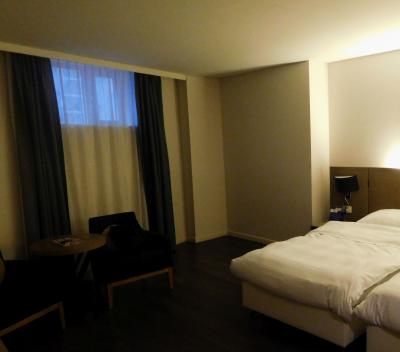 ホテルの部屋は予想以上に新しくてモダン。ただ、窓の外は山の斜面で眺望はない。