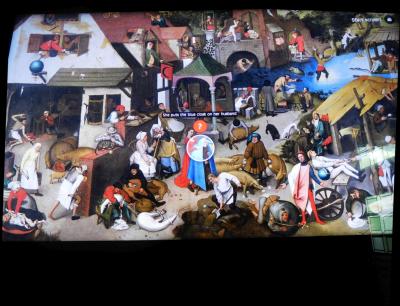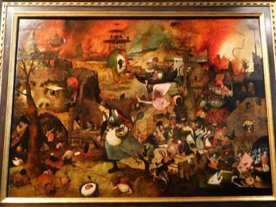 [展示品]好感・注目作品:ピーテル・ブリューゲル(父)『悪女フリート』(Dull Gret;Mad Meg)。2019年1月に修復を終えて、戻ってきた作品。ボス『快楽の園』に似た地獄を描いている。中央の悪女フリートが甲冑姿で怪物たちに向かっている。隣に、同『12の諺』。ネーデルラントのことわざが絵画として描かれている。クエンティン・マサイス『十字架のキリスト』。マサイスはアントワープで没した。