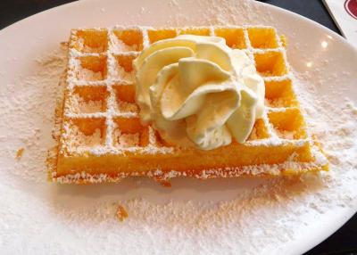 テラス席があり、写真付きメニューがありました。Slagroom (whipped cream)付きワッフルを注文。サクサクして美味しい。ビールとワッフルで、9.10EUR。若いウエイターがアニメで覚えたらしい時代劇調の日本語を話すので驚き。帰国後に調べると、TVでも紹介された有名店らしい。- 旅行時期
