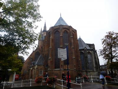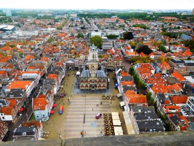 入ると、先に鐘楼に上るように薦められた。ここの階段は非常に狭い螺旋階段で、ギリギリすれ違える程度。私の訪問日は月曜だったので、多分、空いていたのだろう。途中にあるテラスで休みながら、376段の階段を上りきると、地上85mで素晴らしい360°の眺望。眼下にマルクト広場と市庁舎。北西に旧教会、遠くにハーグ。東方に東門。南方にロッテルダム。南西には、「デルフトの眺望」を描いた場所やデルフト駅。旧市街は橙色(赤瓦)の屋根が美しい。下に降りて、教会内部に入ると、オランダで最も尊敬されている「建国の父」オラニエ公ウィレム1世の霊廟がある。この教会は多くの絵画に描かれている。特に、ファブリチウス「楽器商のいるデルフトの眺望」(ロンドン ナショナル・ギャラリー蔵)には教会裏側が描かれている。- 旅行時期