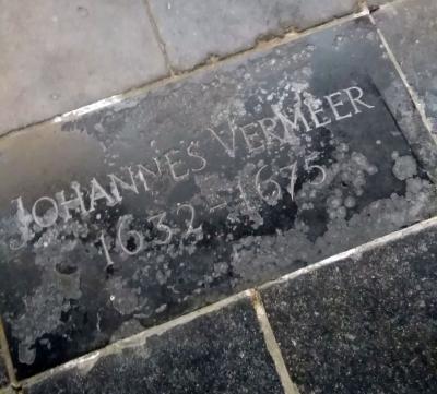 内部はステンドグラスが美しい。ここを描いた絵画が多数ある。床に埋め込まれているフェルメールのパネル、前回訪問時は簡単に見つかったのだが、今回はなかなか見つからず、探し廻ってようやく見つかった。フェルメールの絵画「デルフトの眺望」に、この教会の塔の先端が描かれている。- 旅行時期
