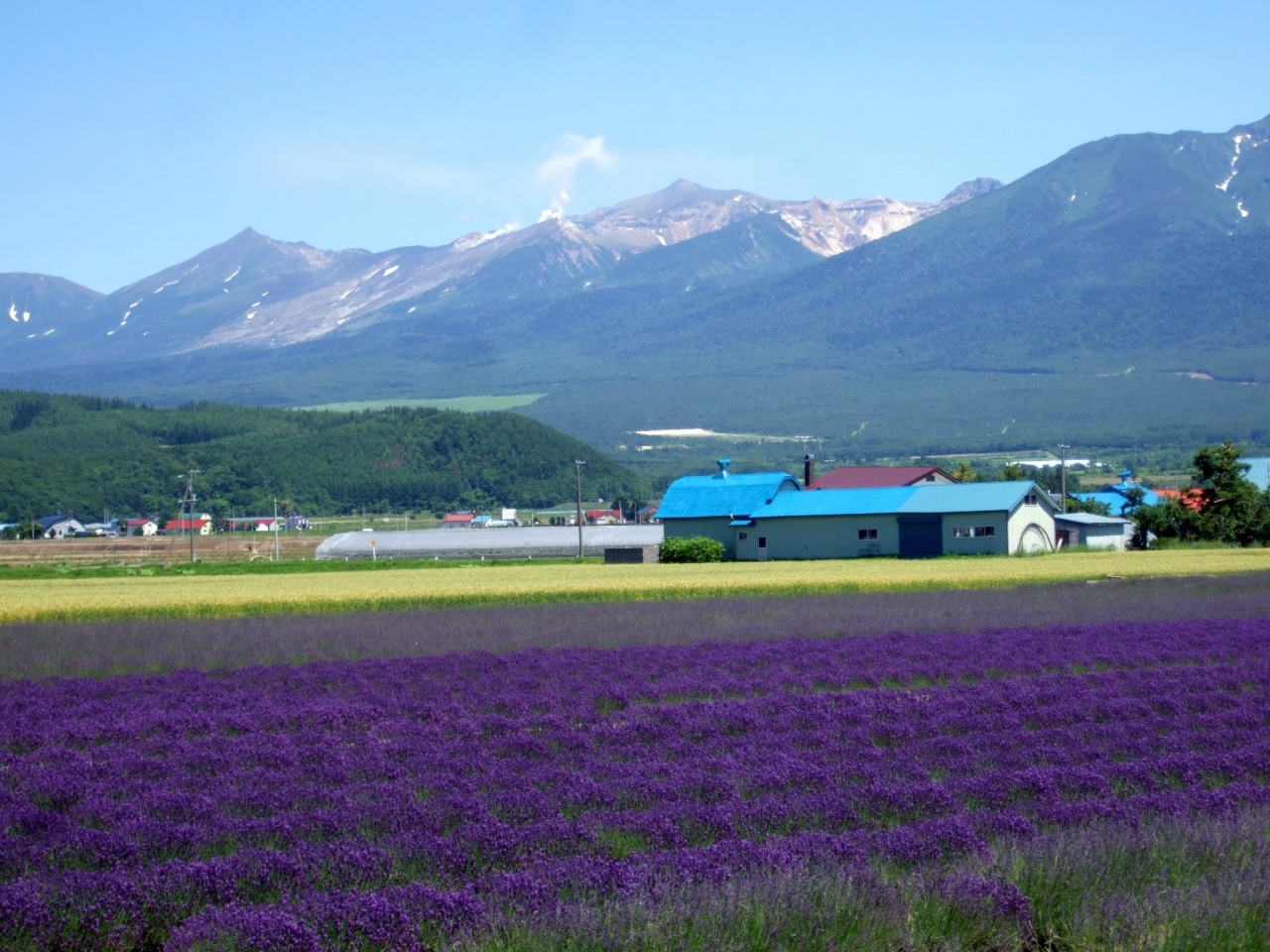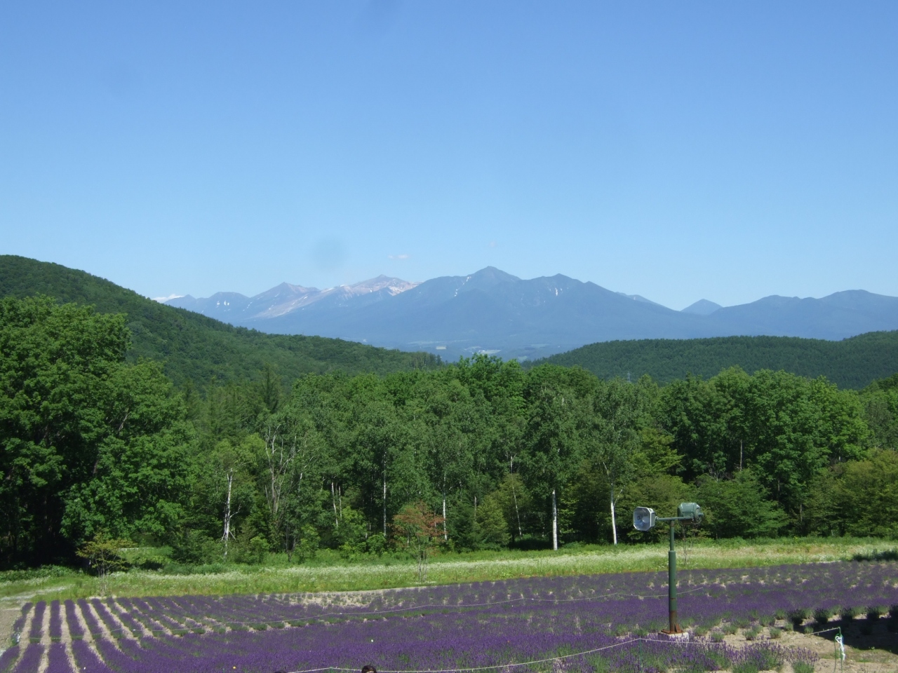 展望デッキから、ラベンダー畑や十勝岳が見渡せる。