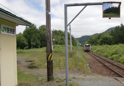 咲来駅は、無人駅で、小さな小屋があるのみ。中の時刻表を見ると、1日に5,6本、列車が停まるようだ。丁度、上りのジーゼルカー(1両編成;乗客数人)が来て停車し、車掌さんから、「乗りますか?」と聞かれた。列車が去ると、また人気の無い駅に戻り、まわりの草花が美しく咲いている。- 旅行時期