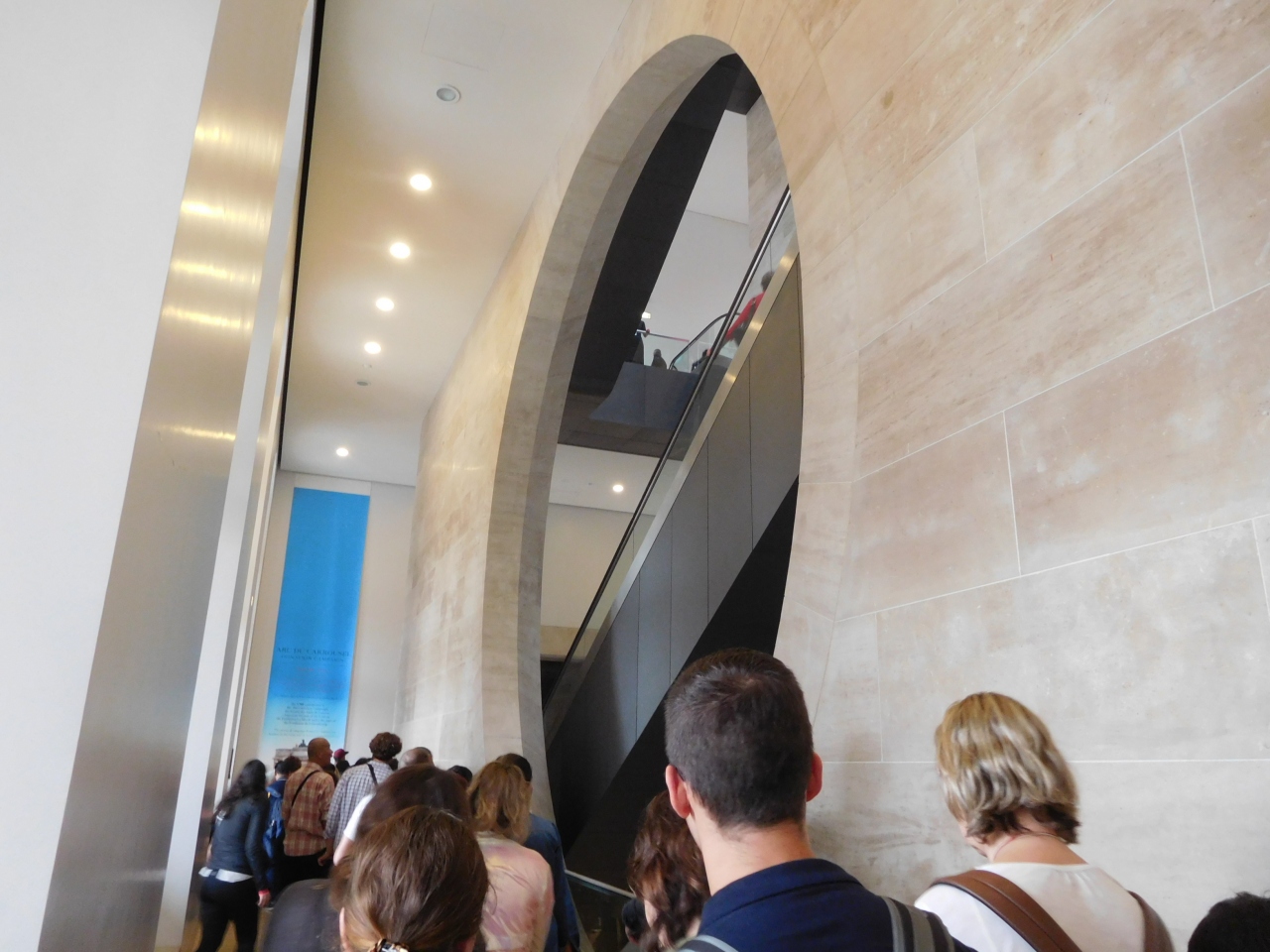 ピラミッドの入口と、チケット売り場の行列は10分ほどで済んだ。ところがフェルメールのあるリシュリュー翼入口に長蛇の列。他のシュリー翼、デゥノン翼から入って辿り着けるか確信がなく、列に並んだ、実は、この行列、臨時に移転しているモナリザへの行列で、数回のエスカレータ乗り換えを含め、2階まで迂回不能。30分以上かかって2階に到達したら、フェルメールへの部屋への案内があり、行列から分かれることができた。