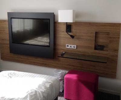 部屋は狭くて、日本の東横イン並み。デスクは小さい。冷蔵庫なし。シャワーのみ。