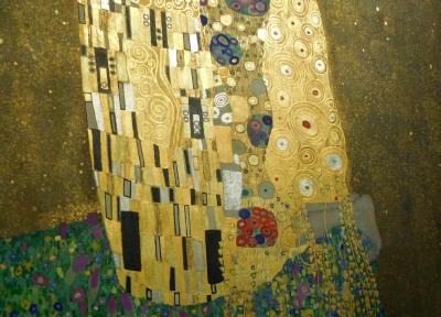次の部屋に、クリムト「接吻(恋人たち)」。入場制限されていて、日本のようなひどい混雑はなし。記念撮影もできる。見る方向により輝点が変わり、実物の迫力。