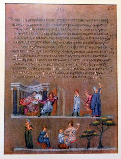 中央通路の両側に、展示が並んでいる。その一つは、装飾写本「ウィーン創世記」(Wiener Genesis)。制作年代は6世紀頃と推定されている。他にも、古地図、楽譜など、面白い展示品多数。滞在時間:30min- 旅行時期