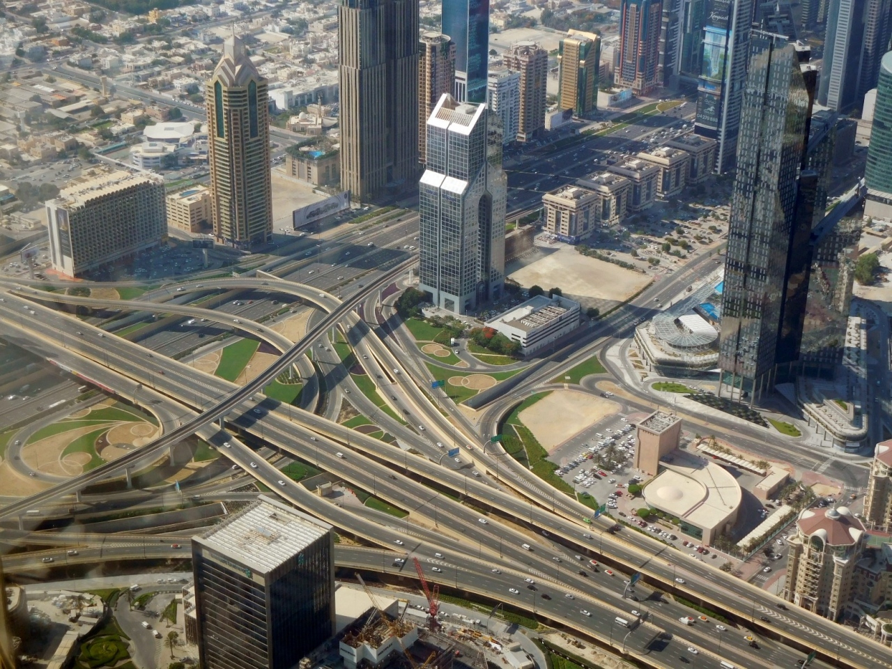 展望台からは、ビル街や高速道路がミニチュアのように見えて、SF映画のようだ。見飽きない景色。124階に下りると、屋外展望台がある。なお、WEB前売り券は、130AED(約4000円)だった。- 旅行時期