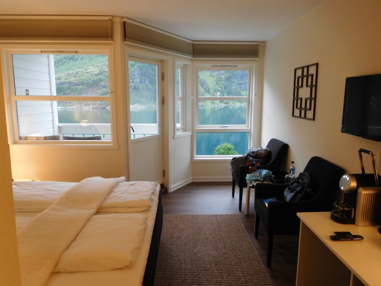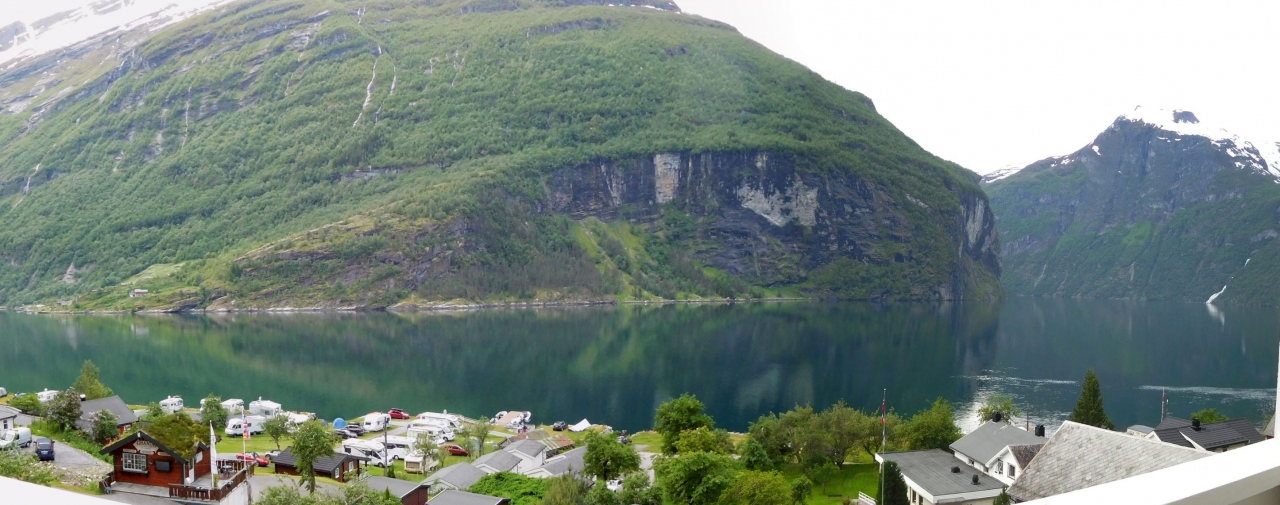 部屋のバルコニーからのフィヨルドの景色は相変わらず素晴らしい。ただ、岸辺がキャンピングカーで埋め尽くされているのが大きな変化。