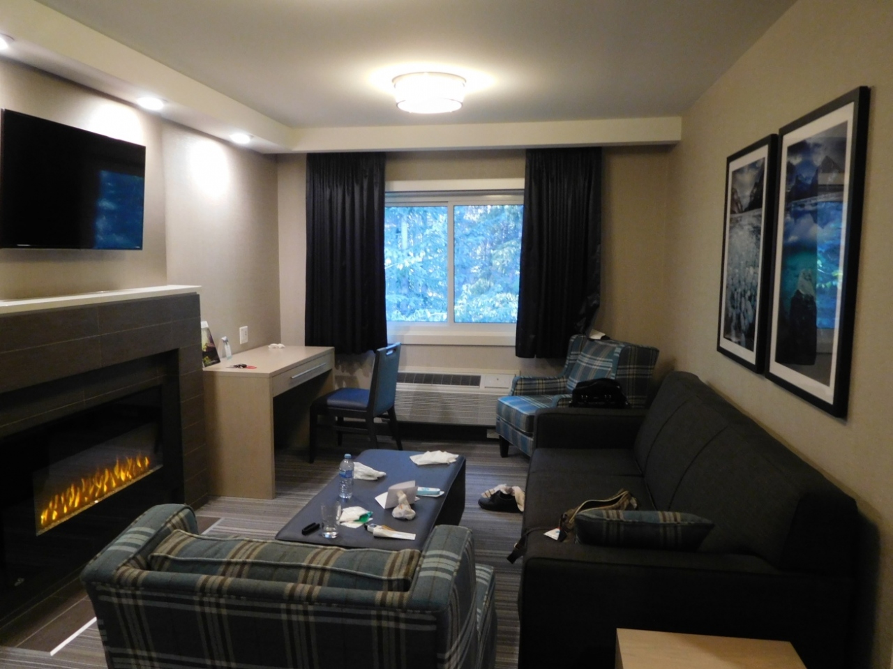 口コミ情報から、かなり古いホテルだが、改装済みの部屋があると知って、ホテルに直接問い合わせ、1泊だけ予約できました。かなり高額でした。部屋は2階だが、エレベータはない。スイート・ルームで、リビングとベッドルームがあり、広すぎる感じだが、快適。液晶製の暖炉(Electric Fireplace)まである。窓の外は林で、眺望はない。