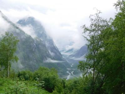 ホテルの裏庭に出ると、眼下に国道が見え、氷河が削った渓谷が遠くまで続いている。