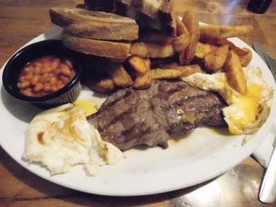 最初は、夕食時に訪問し、ビールと、フィッシュ&チップス(14 CAD)。実に美味しい。出発日の朝11時の開店前に訪問したら、10人程度の行列。ステーキ&エッグスは、8ozのサーロインと2個の玉子料理。パンも付いて、20 CAD。食べきれないので、ボックスを貰い、持ち帰りました。大満足で、お薦めです。WIFI可能。- 旅行時期