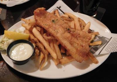 1回目は、ギネス($9)とフィッシュ&チップス($18)。これが素晴らしい味。