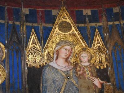 [展示]シエナ派の傑作(フレスコ画)を堪能できる。シモーネ・マルティーニ「マエスタ(荘厳の聖母)」が最高。同室の対面に、「騎馬のグイドリッチョ・ダ・フォリアーノ」。隣室に、アンブロジョ・ロレンゼェッティの「良き政府と良き政府の効果」など。中央にあるシニョーリ礼拝堂も素晴らしいフレスコ画に覆われている。