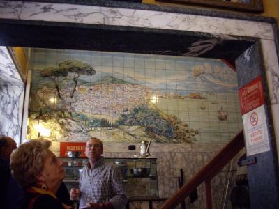 1923年からの老舗で、店は綺麗ではないが、入り口のところにはマヨルカ焼きのタイル絵があり、その前で職人さんが、ピザ打ちと窯焼きを行っている。地元の人も多く押し寄せ、店の前には行列ができていて活気がある店内。定番のマリナーラとビールだけでもおなか一杯で、3.5ユーロからと(サービス15%)格安でした。ダ・ミケーレの向かいの通りすぐなので、食べ比べてみると面白いです。