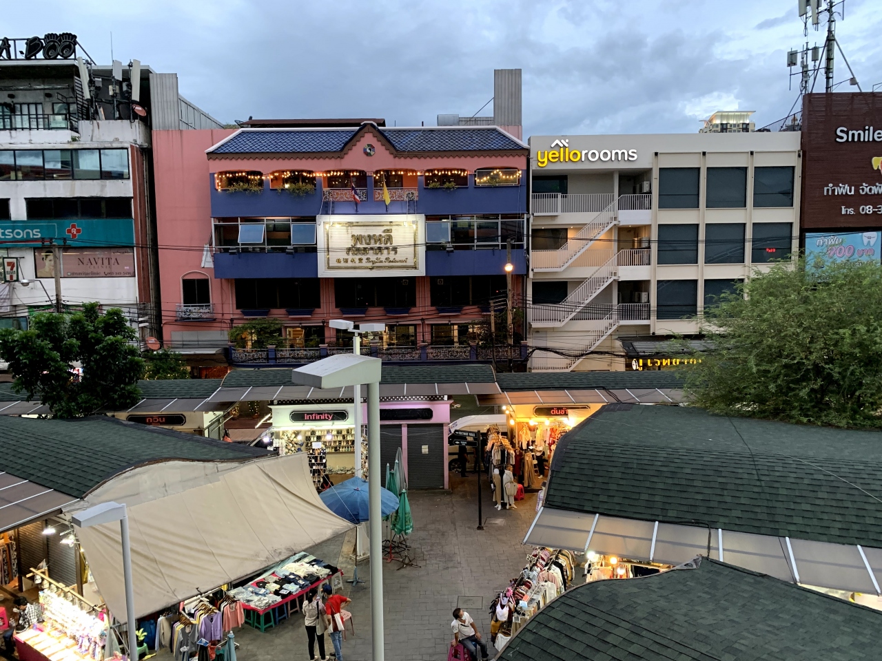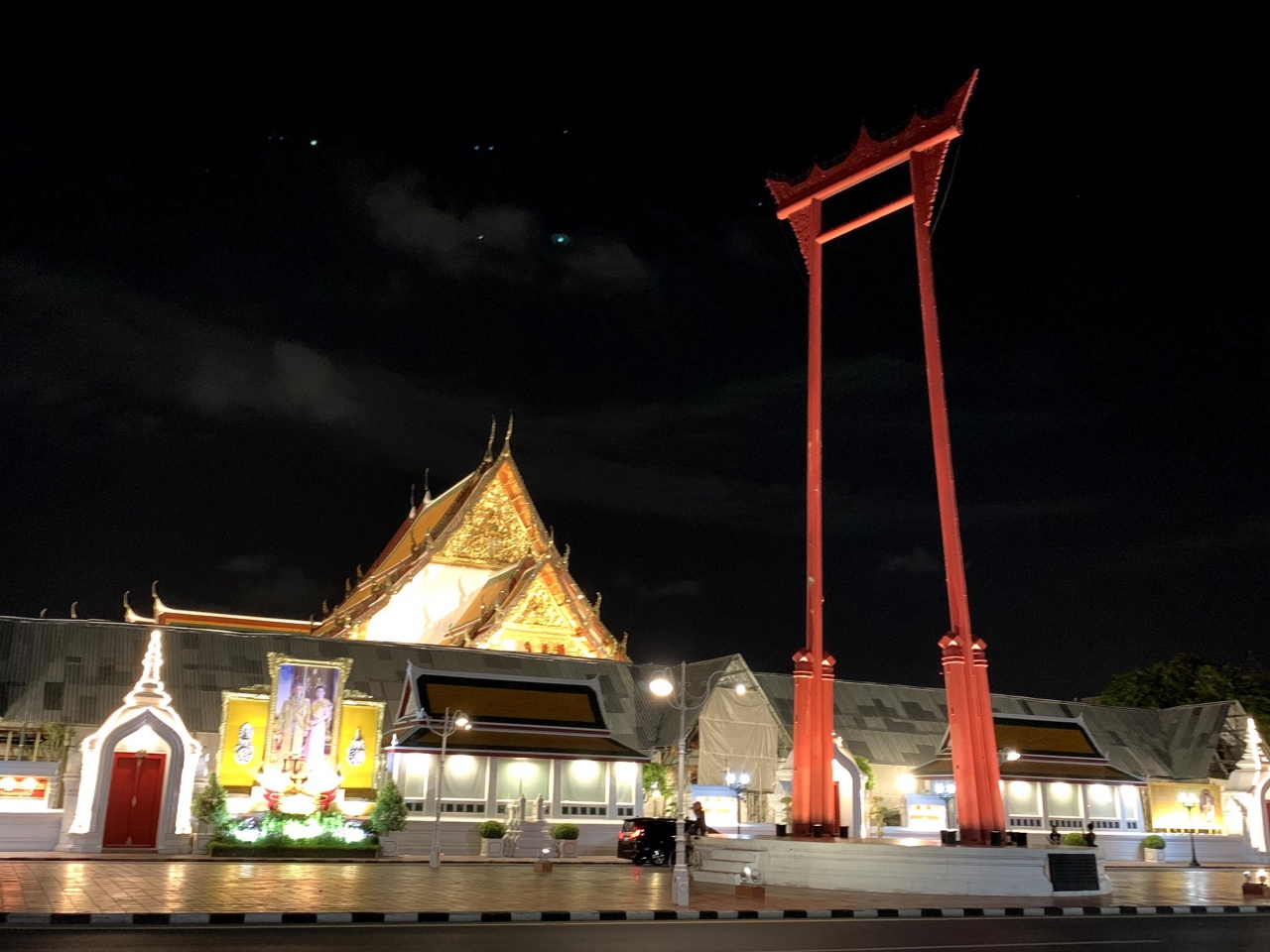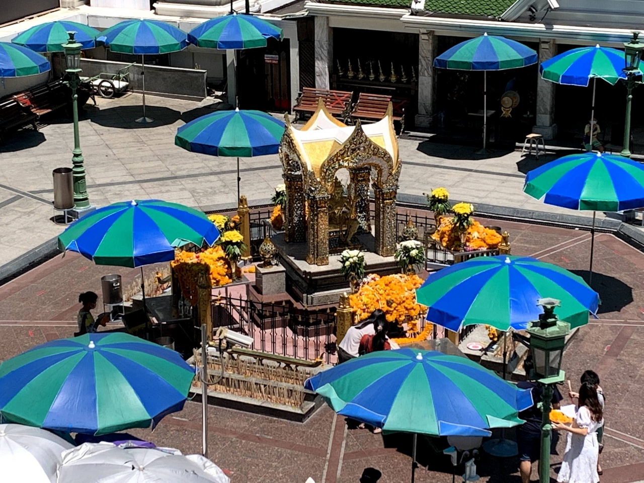 サイアムスクエアからセントラルワールド方面に歩くと大きな交差点の角にあります。この一角だけとても宗教的な雰囲気になっています。キラキラのお堂があり、お参りに訪れている人たちがたくさんいます。高架のスカイウォークからも眺められる場所にあります。