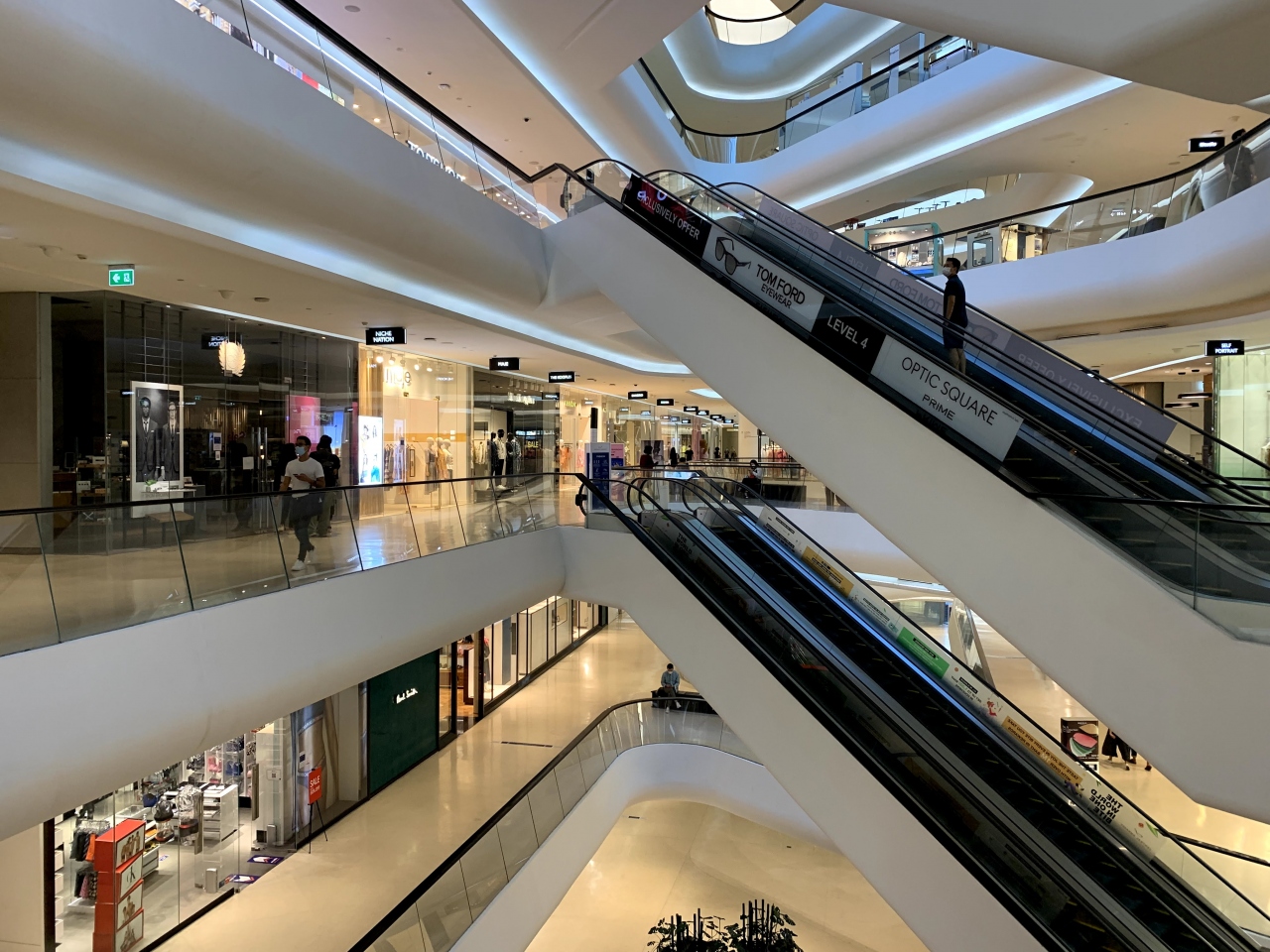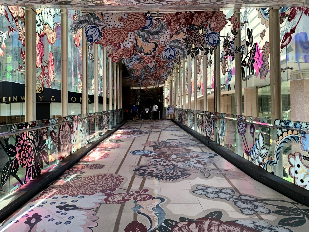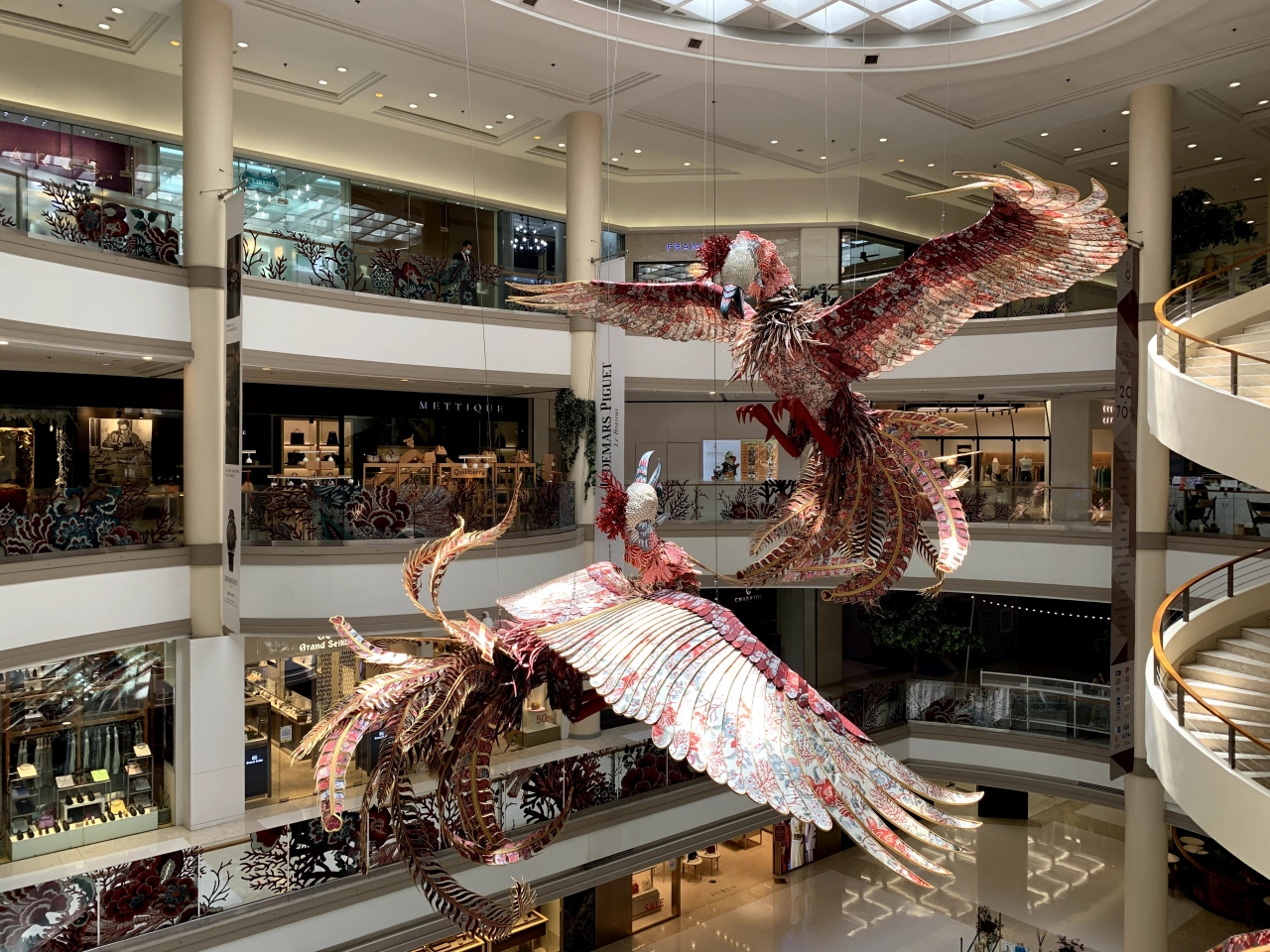 スカイウォークからのエントランスのディスプレイ(アート)が非常におもしろく、若い女の子たちがたくさん写真をとっています。デパート内のエスカレーターがある吹き抜け部分にも大きな鳳凰のような鳥のアートがあり、圧巻です。インスタ映えするデパート。