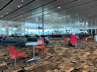 コロナ禍のため、ターミナルのレストランやショップは一切営業を行っていません。乗り換えの場合、移動はすべて便ごとに統制されていますので、待合ゾーンから出ることはできません。ロビーは比較的空いていますので、横になって仮眠することもできます。食事を取りたい場合は、待合ゾーン入り口で電話にて出前をとることができます。自動販売機もあります。