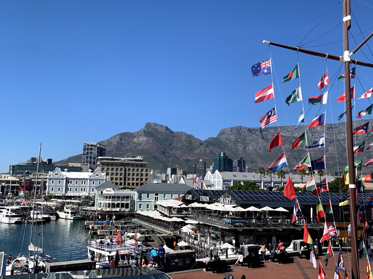欧米の港街といった感じの素敵なウォーターフロントです。とってもおしゃれなカフェやレストランがたくさんあります。朝昼夜問わず、食事や休憩をするのに最適です。どこもWifiがだいたいあるので、ネットにも繋げます。V&Aからも晴れた日はテーブルマウンテンが眺められます。観光バスの起点でもあるので、チケットを買うにも、乗り降りするにもん便利です。