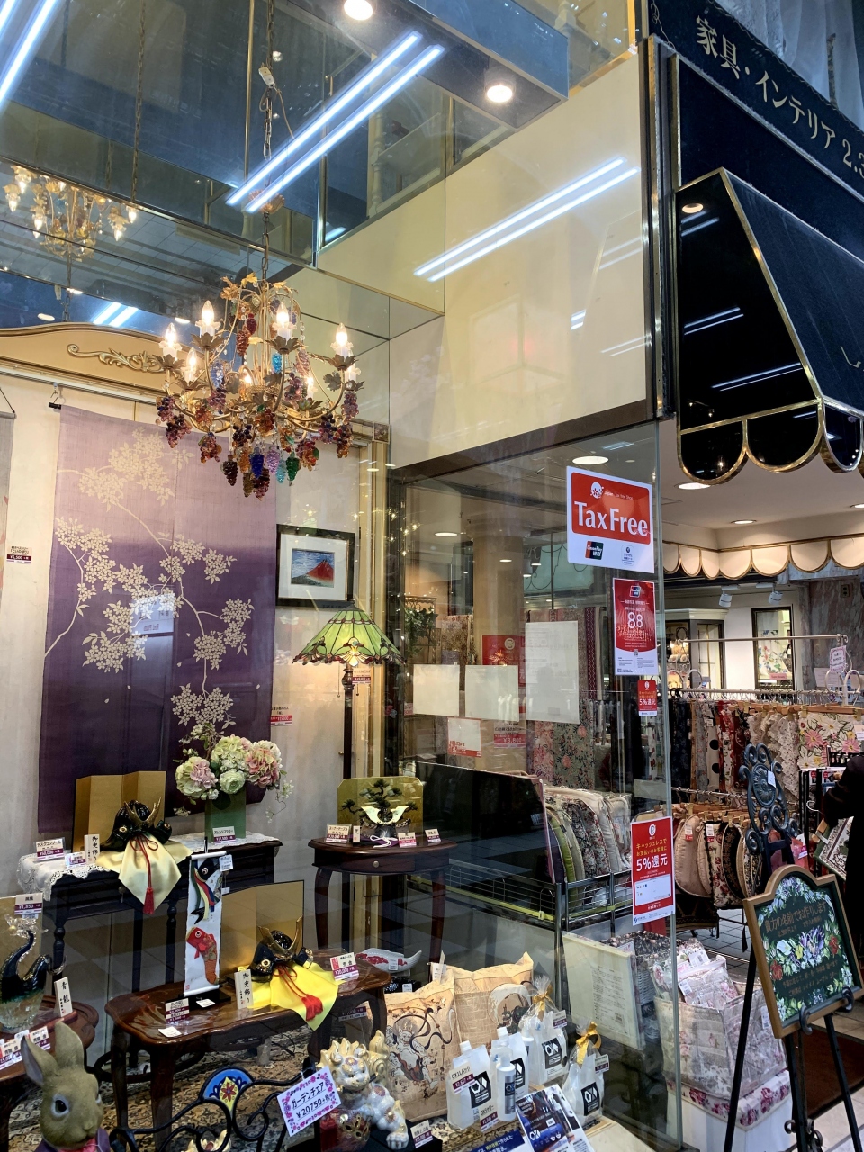 福岡天神駅のすぐ近く、新天町商店街にあります。天神で老舗の輸入雑貨店です。アンティークの雰囲気のお店で、コーヒーカップやお皿などの比較的手頃なものから、高級めの絨毯やシャンデリアなどインテリア類も売っています。