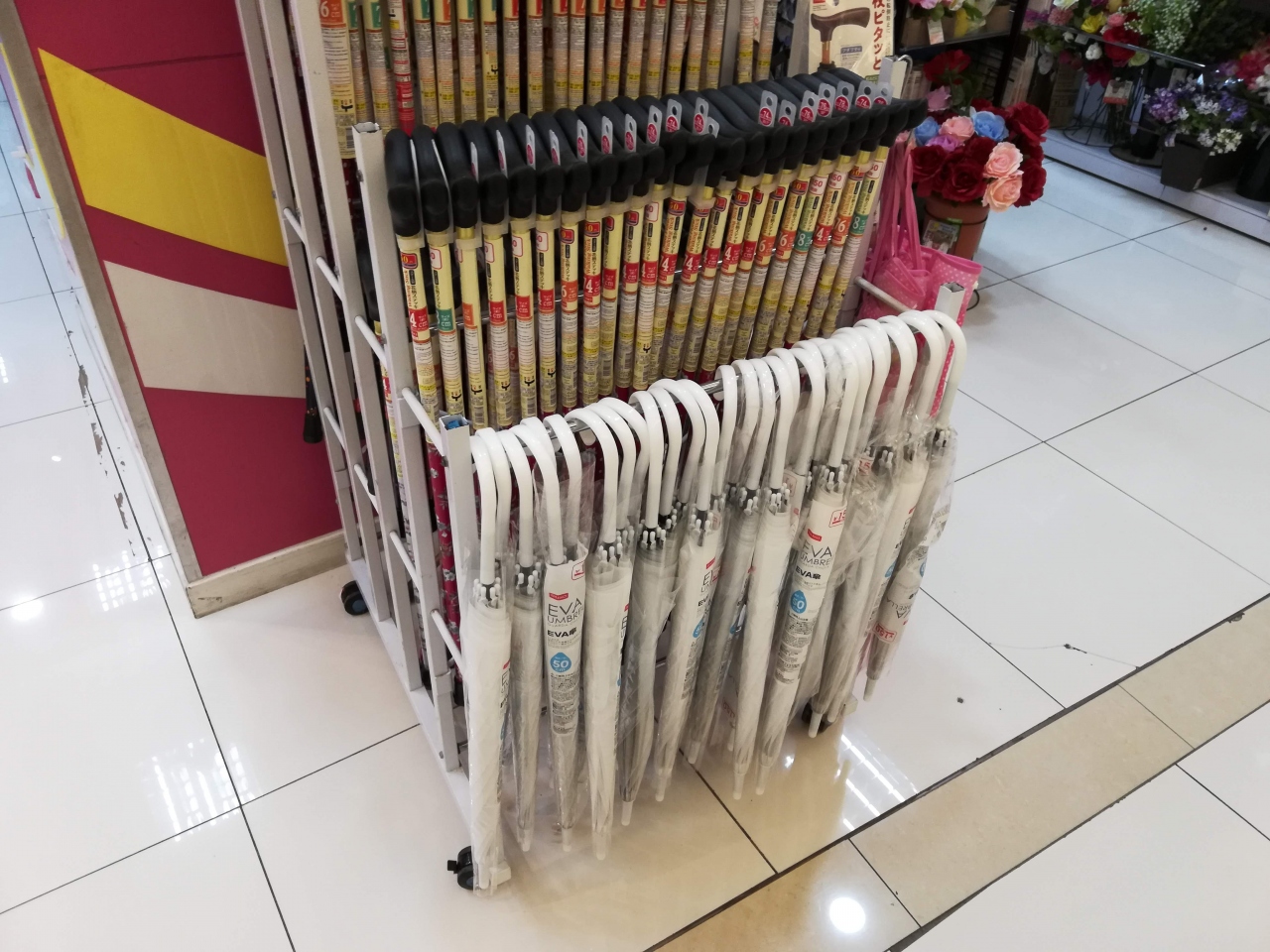 カンボジアは5月ごろから雨季に入り、急な雨に襲われることがあります。イオンモールの2階に入っているダイソーでは、日本のダイソーと同じ感覚でビニール傘が売られているほか、レインコートやポンチョも売っています。急に必要になった時は便利です。