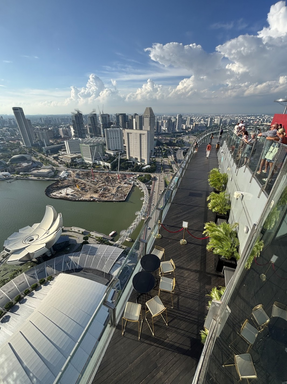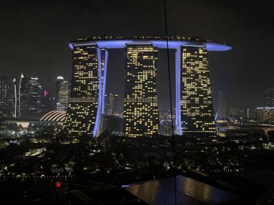 マリーナベイサンズのサイトからEチケットを事前にオンラインで購入しておき、指定の時間に入場します。当日に窓口で購入することもできるようですが、希望の時間に入場できない場合があるようです。上空からの眺めは最高で、シンガポール湾のはるか向こうまで見晴らすことができます。ベンチが極端に少ないので、少し滞在したい場合はデッキに座るための小さなシートなどを持っていくとよいかも。