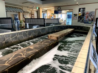 ランチタイムのおすすめメニューになっているイカの活き造り定食2900円を注文しました。やや値が張りますが、呼子でイカが食べられる食事処では、活き造りを含むメニューはだいたい3000円から4000円のようでした。いけすから揚げたてのイカ刺しが新鮮で非常においしいです。ゲソなどは天ぷらにしてもらえます。