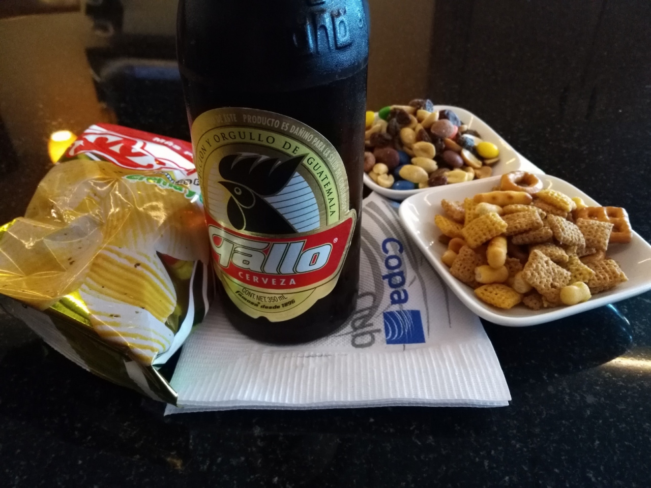 カウンターバーでは、ワイン、ビール、ラム、テキーラなどのアルコールやソフトドリンクもオーダーできます。その他には、コーヒー、お茶、クラッカー、チーズ、チップス、ナッツなどのつまみがあります。こちらはセルフサービスです。せっかくなので、グアテマラのビールを頼んでみました。- 旅行時期