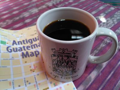 ということで、カフェ・コンデサにて昼食を。グアテマラで最初の一杯となるグアテマラコーヒーを飲んでみました!値段は14ケツァール(210円)。しかもおいしい!というか、スタバでも使われているとおり、よく口にする味です。そして、アメリカンといいながら、しっかり濃いめ。話しに聞いた通り、グアテマラのコーヒーはとってもおいしいです。