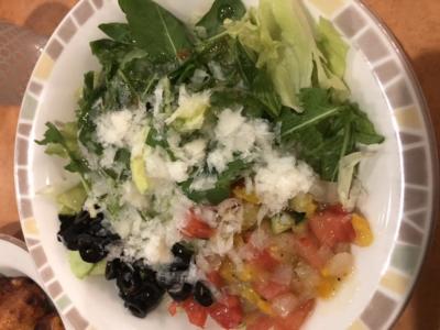 今回はコブサラダを食しました。少し癖のあるオーロラソースのようなドレッシングが野菜に合いますね。仕事帰りだったので赤ワインを飲みましたが、防腐剤がたくさん入っているようで翌日に残りました。良く値段相応と言いますが、お値段以下ですね。あっ、サラダは美味しかったですよ!