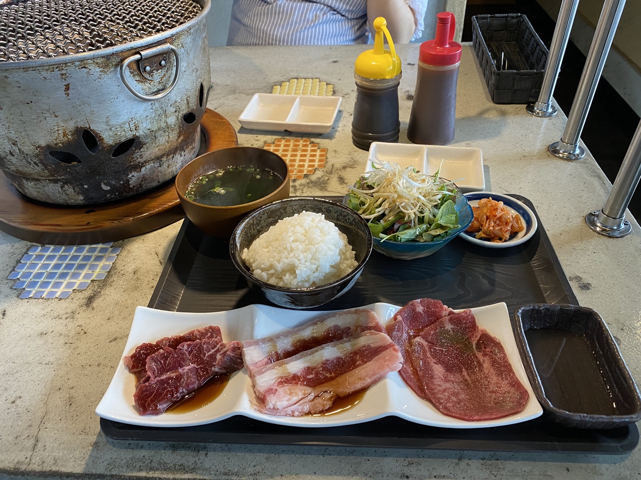成増駅南口すぐのビルにある焼肉屋さんです。このお店はとにかく広さと清潔さが魅力。PayPay還元キャンペーンということもあり、カルビハラミタンのランチセットを頼んじゃいました。七輪で焼く本格的な気分を味わえます。
