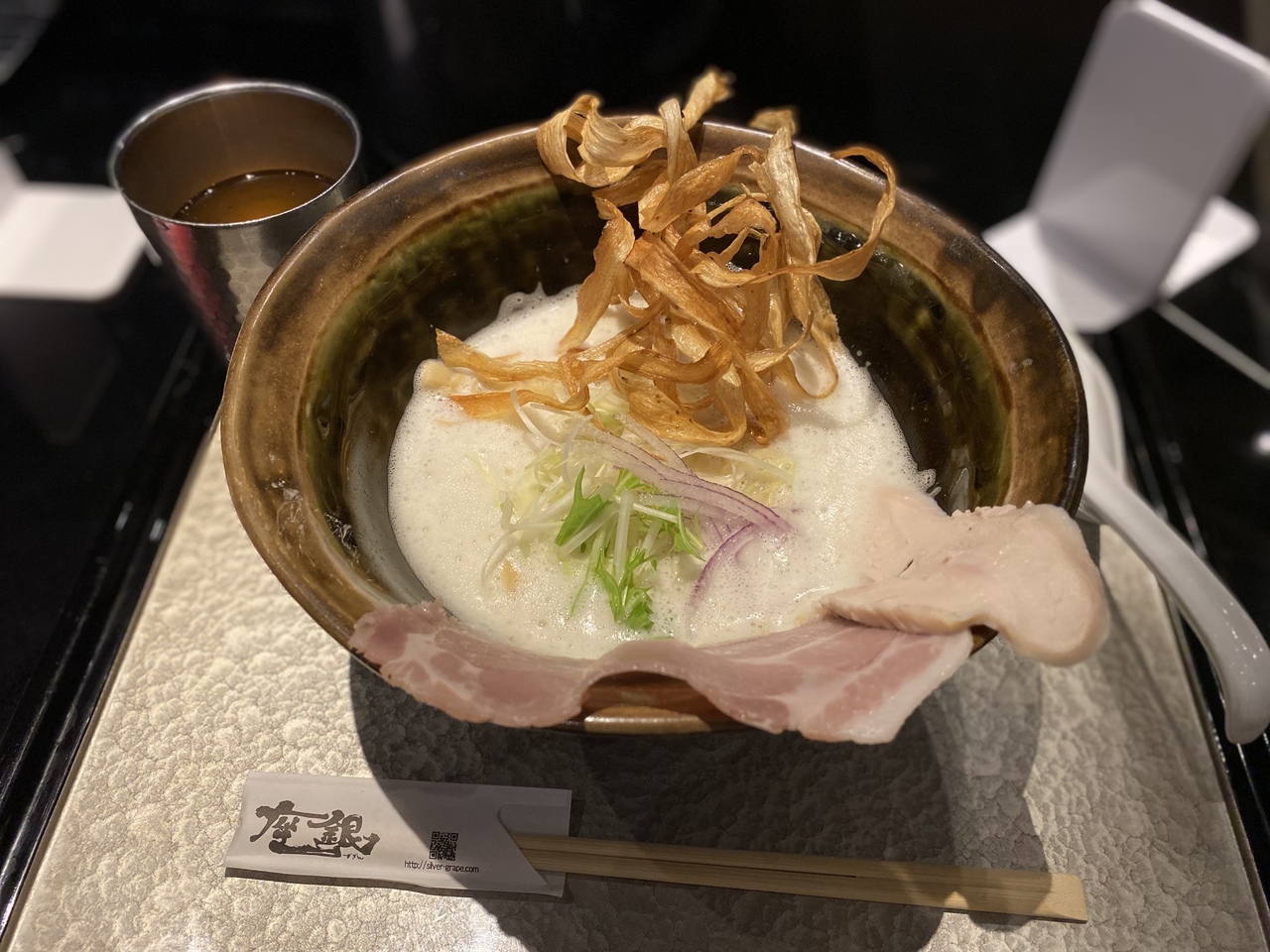 肥後橋駅近くにある、この界隈では有名なラーメン屋さんです。関西支社の同僚と一緒にランチをしました。鶏そばとして有名なようです。少しだけ並んで入りました。お洒落な見た目のお皿に盛られて出てきます。ごぼうの天ぷらが特徴的で美味しいです。濃厚です。大阪の蒸し暑い夏には麺類ののどごしが不可欠ですね!