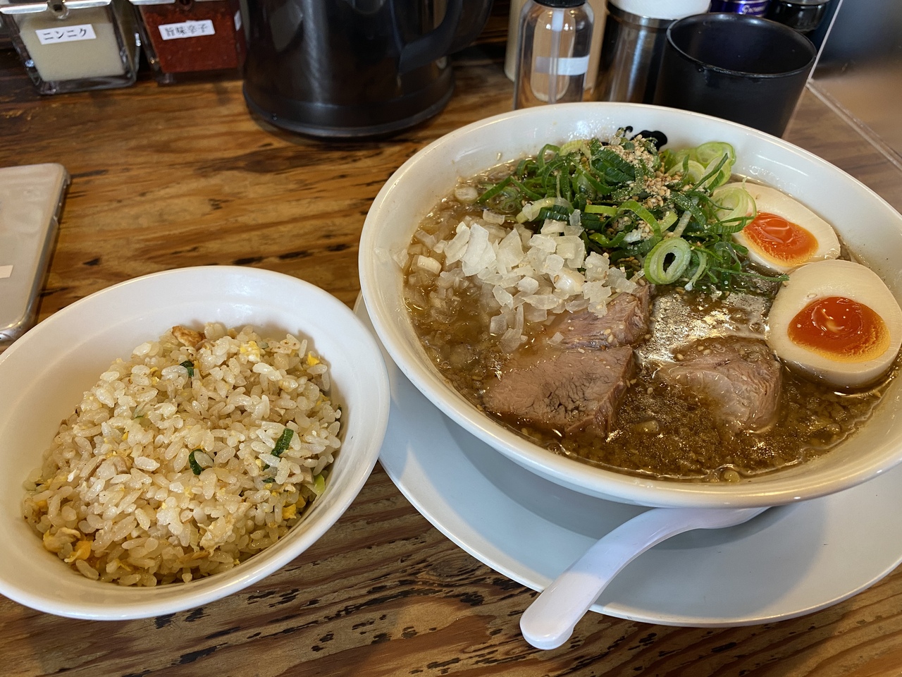 池袋駅界隈にある有名店です。賛否は分かれますが私は賛です笑 たまに無性に食べたくなります。この日は週末に試験が終わったので昼の打ち上げで食べました。やっぱりこのコッテリ感は嫌いにならないですね笑 味玉もしっかり浸かってて美味でした。