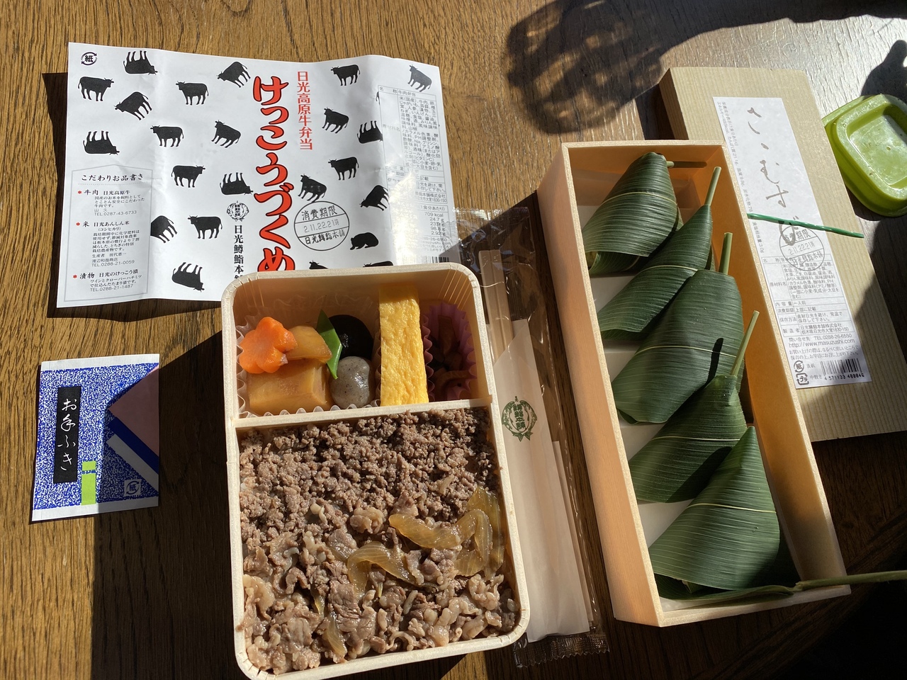 鬼怒川温泉と下今市を結ぶSLです。東武沿線に住んでるとサブリミナルのようにポスターを見せられるので乗りに来てしまいました笑 SLで食べようと、ちょっとリッチな駅弁を購入。ドリームカーを見物していたら食べ過ごしましたが、下今市でゆっくり食べました。