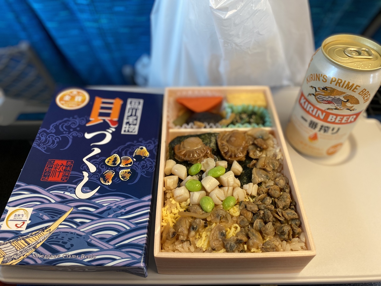 久々の家族旅行。東海道新幹線に家族3人で乗るのは初めてです。11時発ののぞみだったので、東京駅で駅弁を調達。東京の駅弁はなかなか買う機会がないので、ワクワクしますね。この日は品川感満載の貝づくし弁当を購入。一番絞りに合いました。
