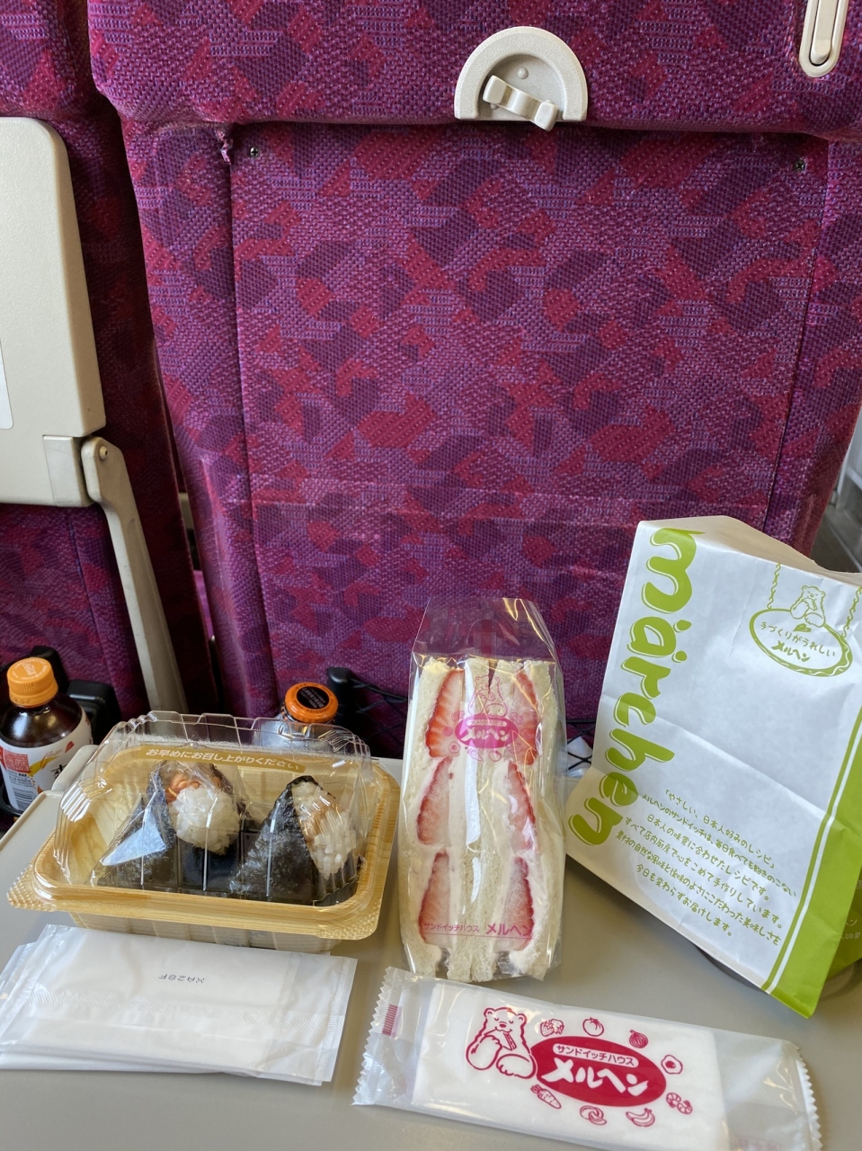 群馬に旅行に行く際に、グリーン車でいただきました。なんとも優雅な朝ごはんです。前々から気になっていたイチゴのサンドイッチを購入。1歳の息子にもがっつり食べられました。3分の2ずつ、いっちょまえです笑 サンドイッチと思うと高額ですが、ケーキと考えればありですね!