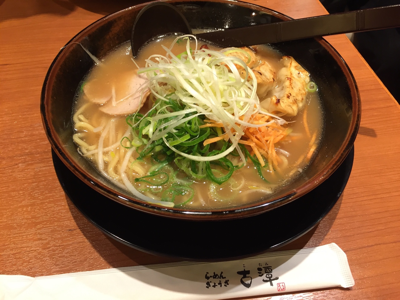 大阪出張帰りに関西支社の同僚が名物として案内してくれました。しょうゆ味の餃子ラーメンを注文!笑 ショーケースのインパクトがすごかったのですが本物もなかなか。ラーメンは見た目の割にあっさり。その分、餃子のパンチが効いていました。