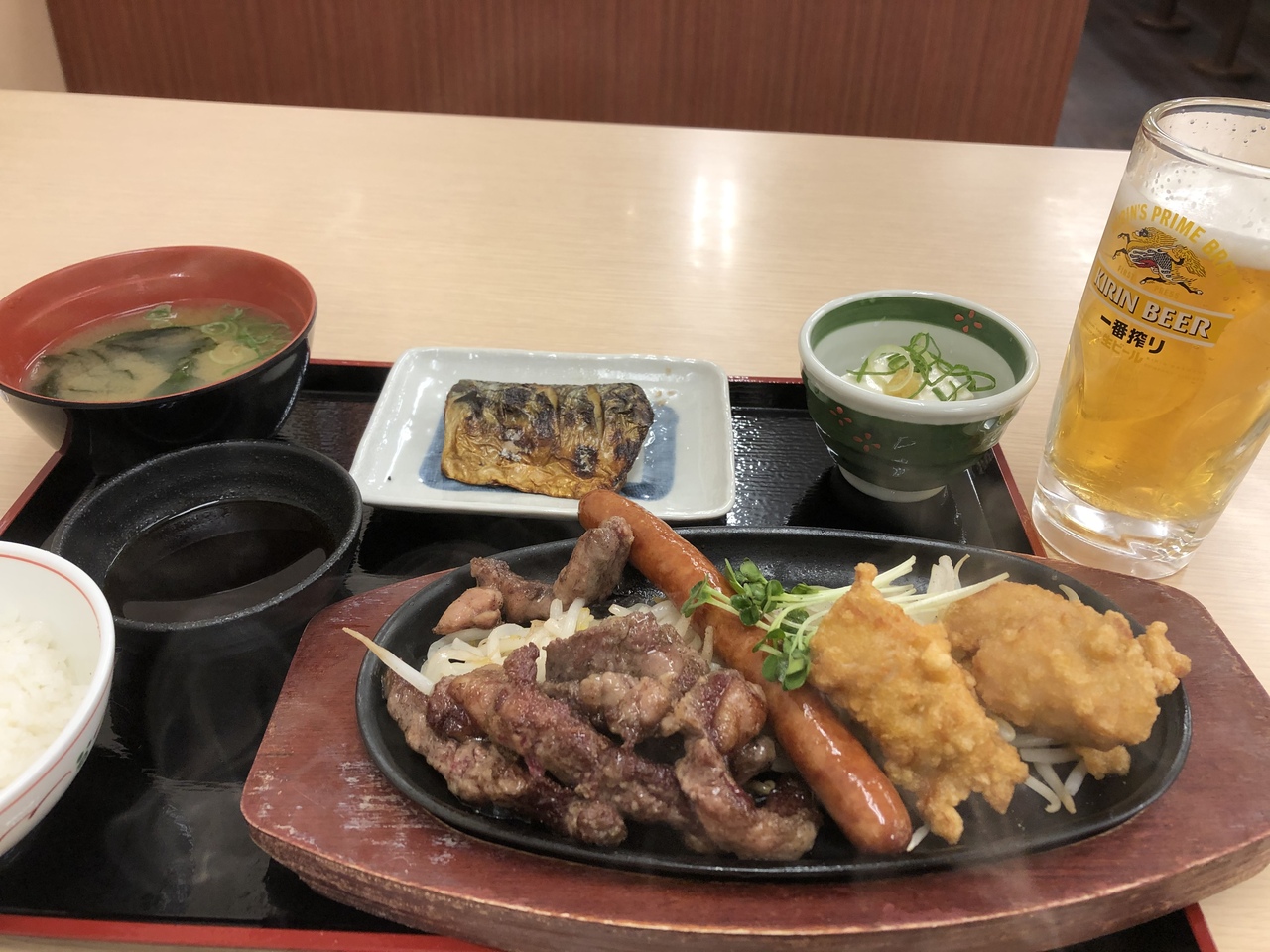大阪出張で利用しました。仕事の後の前日移動だったので遅めの到着。東京と違って深夜に営業している店は少ないので、これはコンビニ飯か…と危惧したときに煌々と光る定食屋さんを発見。ガッツリ系の牛肉とソーセージ、唐揚げを注文。鯖も格安で付けちゃって大満足でした!