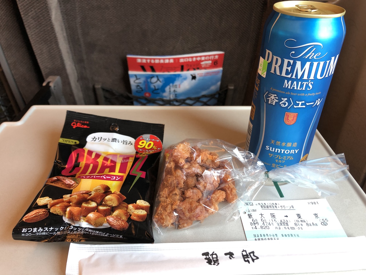 大阪出張時に利用しました。ポイントが貯まっていたのでグリーン車を利用しましたが、せっかくなのでおいしいおつまみを、と言うことで、このお店をチョイス。300円の軟骨から揚げは、上品な揚げ加減で走る居酒屋を彩りました。