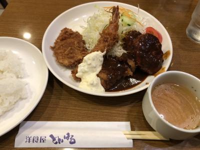 大阪出張と言えば洋食!と関西支社の同僚に言うと驚かれますが、サクッとした揚げ加減、そしてリーズナブルな価格設定は大阪特有なのかと思います。とんはるはまさに大阪の洋食ランチと言うラインナップ。900円でとんかつ、ビーフカツ、エビフライ、ハンバーグ2枚…!豪華すぎました笑
