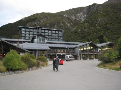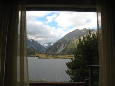 ・マウントクックは前方の山に隠れてしまうためモーテルからは見えません。
