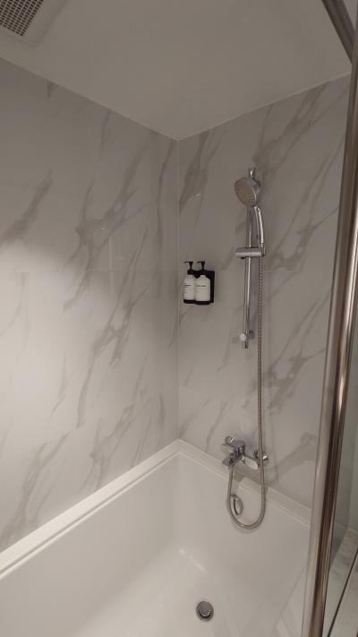 バスタブも広め、シャワーヘッドは3段階の水流切替付きで楽しめます。水圧、湯圧も問題なかったのですが、少し一定しなかった感があります。